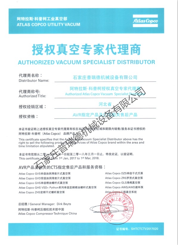 2017年真空泵代理证书