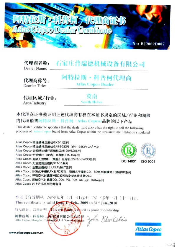 阿特拉斯·科普柯授权证书2009